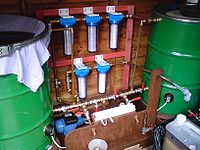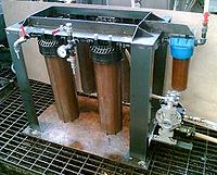 Home built filtration plants use cylindrical 5, 10 and/or 20 inch filter cartridges and/or bag filters, due to their low cost and easy availability. One or more are placed in series, with gradually reducing micron filtration grades. These are described as 50/20/5/1 or similar, denoting an initial 50 micron filter followed by a 20 or 10 micron all the way down to 1 micron. Such systems are usually driven by an electric pump such as the TAM105, or pneumatic pumping is employed.