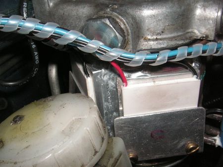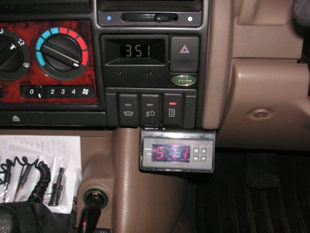 All four heaters draw about 10 amps when running, so a 22 amp relay was employed. The relay is additionally switched by a dashboard switch, so the electrical heating can be switched off but the temperature still monitored. The switch is a modified Disco HRW switch, turned 90° and mounted above the controller in a conveniently empty switch slot. By turning it, the little graphic on the switch, sort of makes sense for a heated filter.