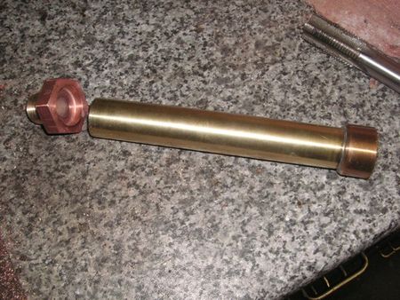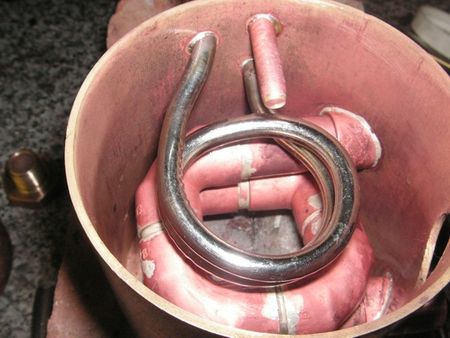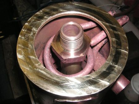 Getting sufficient pipe to protrude through the body was a problem, but it was solved by silver soldering straight end feed fitting into the body, installing the coil in them and then soft soldering the coil to the fittings from the inside, through the open ends of the fittings. Extension pipes were then soft soldered externally for the hoses.A flange was made for the bottom of the unit and silver soldered in place. Photo shows the flange and the centre tube in place ready to receive the original filter.