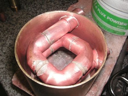 The water heating coil was made from standard 15mm copper pipe fittings. It may have been easer to make using 180° return bends, but 90° items were to hand. These were silver soldered together so later fitting of the coil to the body could be done with soft solder without affecting the coil’s integrity.