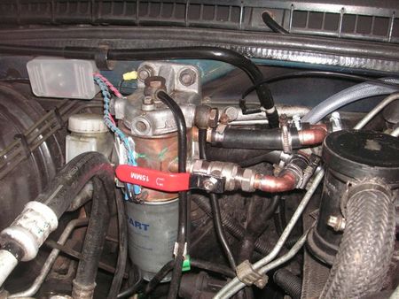 The vehicle is a 1998 Land Rover Discovery, which takes for ever to reach working temperature if the engine isn’t under load. Unlike running on vegetable oil the car will start fine on cold bio, the problems come when precipitated wax/HMPEs are drawn from the tank and block the filter, so both electrical and water heating was used with the thinking that once the engine has started the filter needed to be warmed as quickly as possible and with ample electrical power available, an electric heater should fit the bill until normal running temperature was reached.