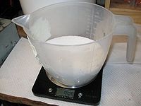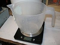 First off use the TARE function on your scales to account for the empty weight of the measuring jug. The scales should display 0g.