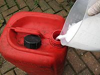 Finally, once the correct weight is achieved, take the scoop of catalyst outside and carefully add it to the methanol. If you used a measuring jug, either squeeze the sides to guide it in, or use a funnel to direct it into the drum.