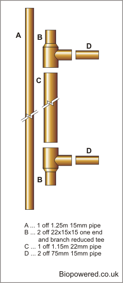 22 to 15 unequal tees are used at each end to seal the inner 15mm to the outer 22mm and allow water to be passed in the gap between the two pipes, forming a water jacket around the 15mm pipe.