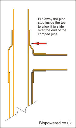 Before fitting the tees the stops need to be removed to allow the 15mm pipe to pass through the fittings, and then the fittings soldered to the two pipes.