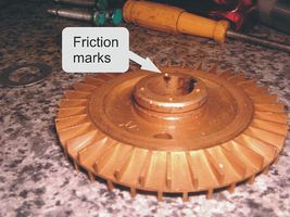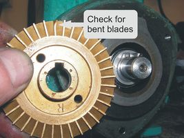 Reassembly is a simple matter BUT, it's imperative the impeller is positioned correctly on the shaft. Being a peripheral turbine pump the clearances between the impeller, the lantern ring and the body are critical. If wrong, the impeller will rub and may be damaged. The most accurate measurement which could be obtained reviled that a 0.2mm (8 thou imperial) gap is required between the impeller and the lantern ring. This can be set using feeler gauges. Gently tap the impeller onto the shaft using a tubular drift until friction is felt on the feeler gauge. Finish reassembling the pump and, using a screwdriver through the cooing fan cowl, spin the pump manually. Check for scraping noises and adjust the position of the impeller if necessary. Before putting back into service give the pump a quick spin by powering up the motor and again listen for any interference.