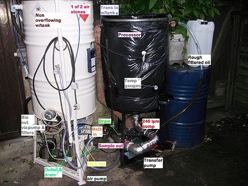 This is probably one of the least complicated processor designs and is suited to those new to biodiesel production. It is similar to the Appleseed processor used extensively in the USA. It can, by quite simple modification, be upgraded with additional equipment to speed the process and could, if desired , be converted into a GL processor. Biodiesel made with this design of processor will require an additional tank for finishing and a separate methoxide mixer.