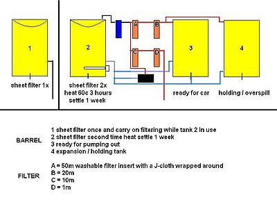 Waste Vegetable Oil can be collected from numerous outlets, for example; cafes, public houses, restaurants, fish and chips shops - anywhere that uses vegetable oils for cooking. The waste produced can be used as a road fuel, but needs to be cleaned before use in a road vehicle. Waste oil contains impurities from food that have been cooked into it, water, meat, fats, etc. These need to be separated from the oil to make it ready for use. There are alot of different ways to clean oil, all variations on a theme; below is a widely used separation system which a lot of domestic users find best, speeding up the natural process of separation.