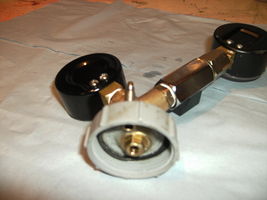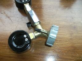 With my one shown above ive found that 35ml of test liquid and 10ml of dry solvent combined with 7gr of calcium carbide is an ideal amount. I grind 7 grammes of calcium and place in the small holder inside then put the two liquids into the vessel, screw the lid on and invert and shake (the marble helps the mixing action)there should be an immediate showing on the lower gauge, keep and eye on the gauge and if it looks like its going to go off the scale shut the valve to the lower gauge and read off the higher one. Take the reading at a set amount of time and try to keep the temp of the tests as constant as posible. The one shown will give a reading from 11 psi with dry oil upto 80 psi with a water content of 4000 ppm. The cycle valve is for releasing a fast rising pressure or when finished. This type of valve has a knurled nut which i leave undone so if the pressure starts to rise too high it can be released by touching a implement such as a screwdriver to it (DO NOT USE YOUR FINGER)