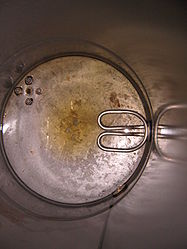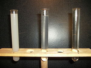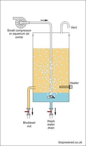 If reacted completely and washed thoroughly, biodiesel should clear within a matter of hours after washing. This is not necessarily an indication that it’s dry so the Biodiesel should be heated to around 50 – 60°C for a couple of hours. To aid this process a bubbler supplied from an aquarium air pump can be placed in the tank. Any water that has dropped out during this process should be drained off. See also Drying wet biodiesel.