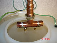 The biodiesel outlet tube on the left is bent over with a 180° return bend plumbing fitting, to prevent water from entering the biodiesel drain pipe during washing.