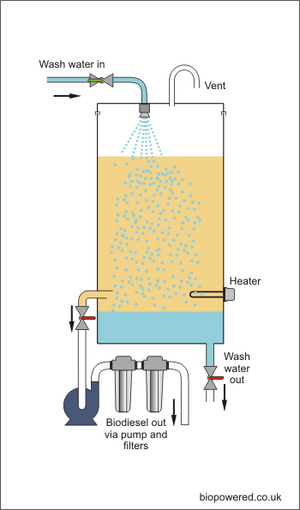 Water washing is a way to remove soap and other contaminants from reacted biodiesel. Typically this involves mist spraying water over the biodiesel, or bubbling air through water with the biodiesel floating on top.