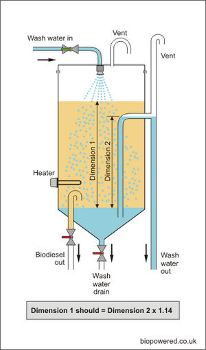 Even the best quality biodiesel will contain some level of contaminants. Many of these are water soluble such as soaps, glycerol, methanol and catalyst. Water washing removes these contaminants quite effectively however it leaves the biodiesel containing trace amounts of water which needs to be removed by an additional drying process. Water washing should ideally be performed around 18 hours after the glycerol is drained. This gives the bulk of contaminants time to settle out and makes the job of washing easer and quicker. It is preferable that this settling is carried out in a separate tank with the biodiesel then being transferred to a wash tank for the washing process.
