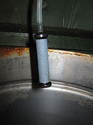 The next stage is to carefully and slowly add some water to the fuel. Add approximately 10% of the biodiesel volume. You then need to turn on the air pump and introduce some bubbles by using a control valve and a ceramic air stone. (If you use an air stone made from a composite material there is a strong likelihood that it will dissolve in contact with the fuel.) Extreme care should be taken in the initial washes with the volume of air as the fuel/water mix does have a tendency to emulsify if the bubbles are too aggressive. We are talking GENTLE here.